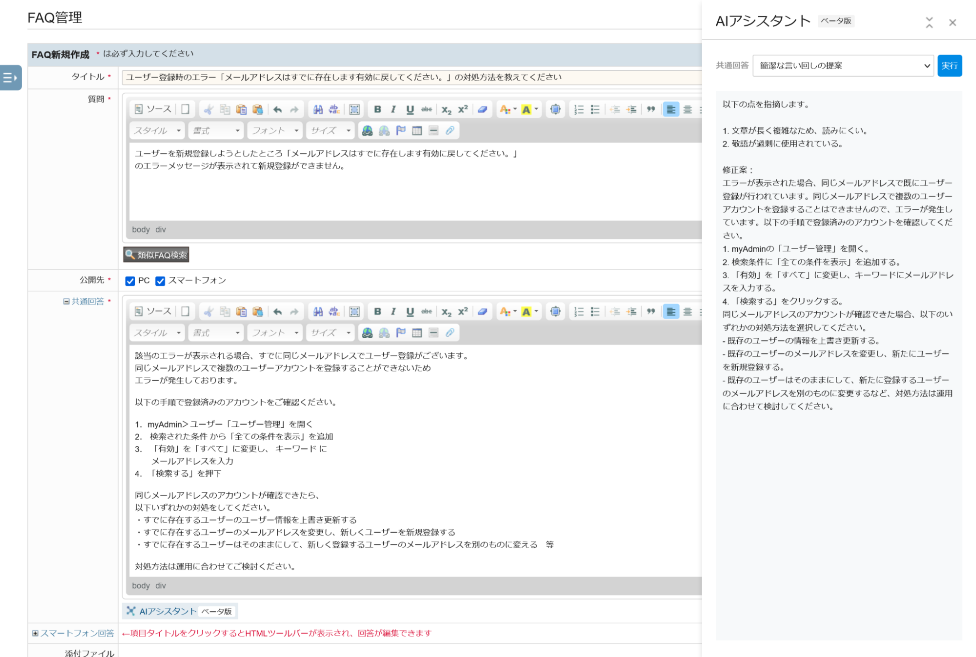校正アシスタント機能は、新規のFAQ登録や編集時に、生成AIを活用して文章校正の提案を行います。これにより、文章作成や編集業務の効率化を実現する他、担当者ごとのFAQの品質のばらつきを防ぎます。