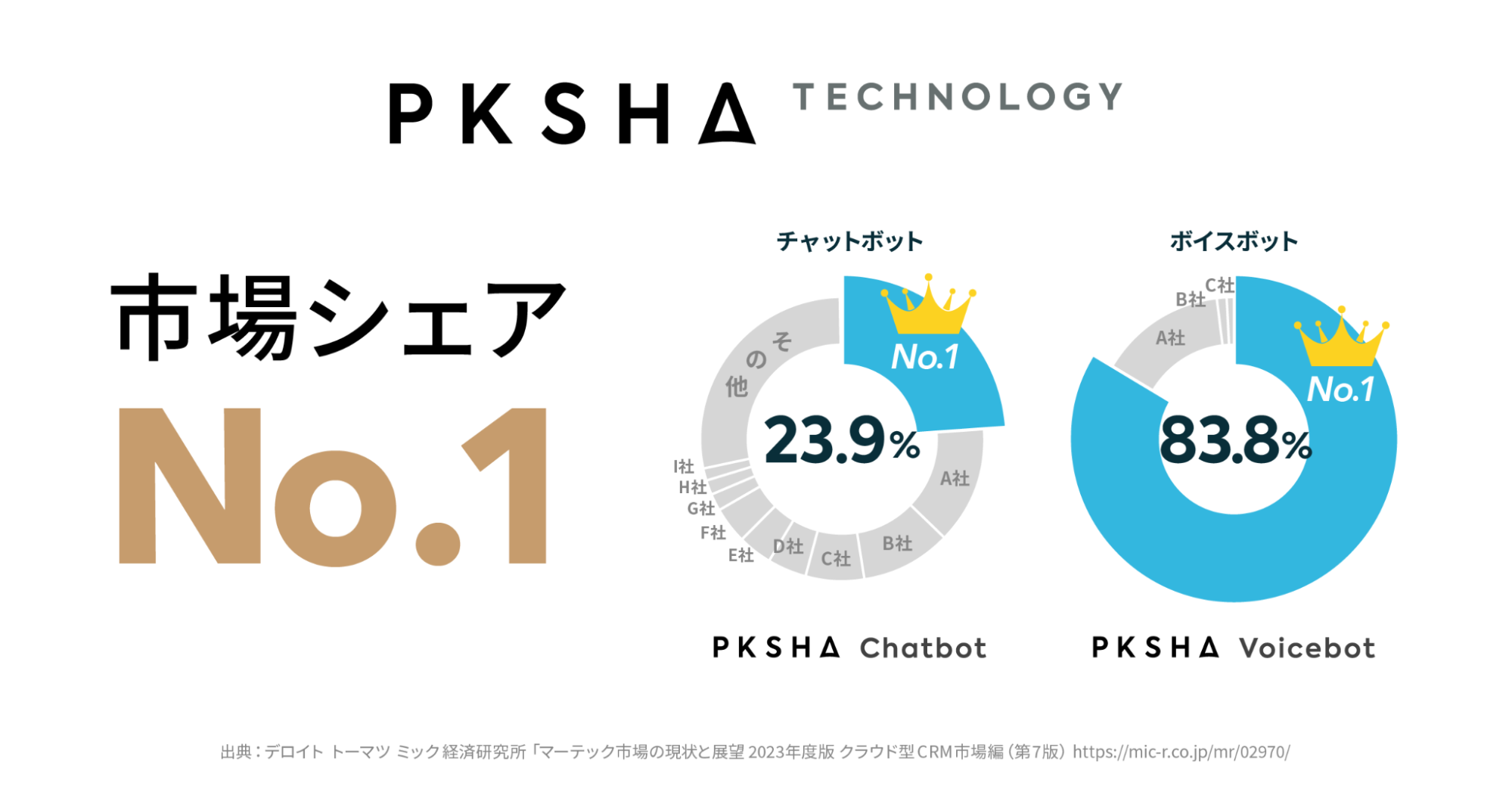 株式会社PKSHA Technology(本社:東京都文京区、代表取締役:上野山 勝也、以下PKSHA)は、PKSHAグループが展開する「PKSHA Chatbot」および「PKSHA Voicebot」が、デロイト トーマツ ミック経済研究所の「マーテック市場の現状と展望2023年度版 クラウド型CRM市場編(第7版)」(※1)で市場シェア1位を獲得したことをお知らせします。PKSHAは「人とソフトウエアの共進化」というビジョンの元、今後も、AIチャットボットやAIボイスボットをはじめとするAI SaaS及びAIソリューションの総合的な展開を通じ、カスタマーサクセス領域とエンプロイーサクセス領域における提供価値の拡大を図ります。