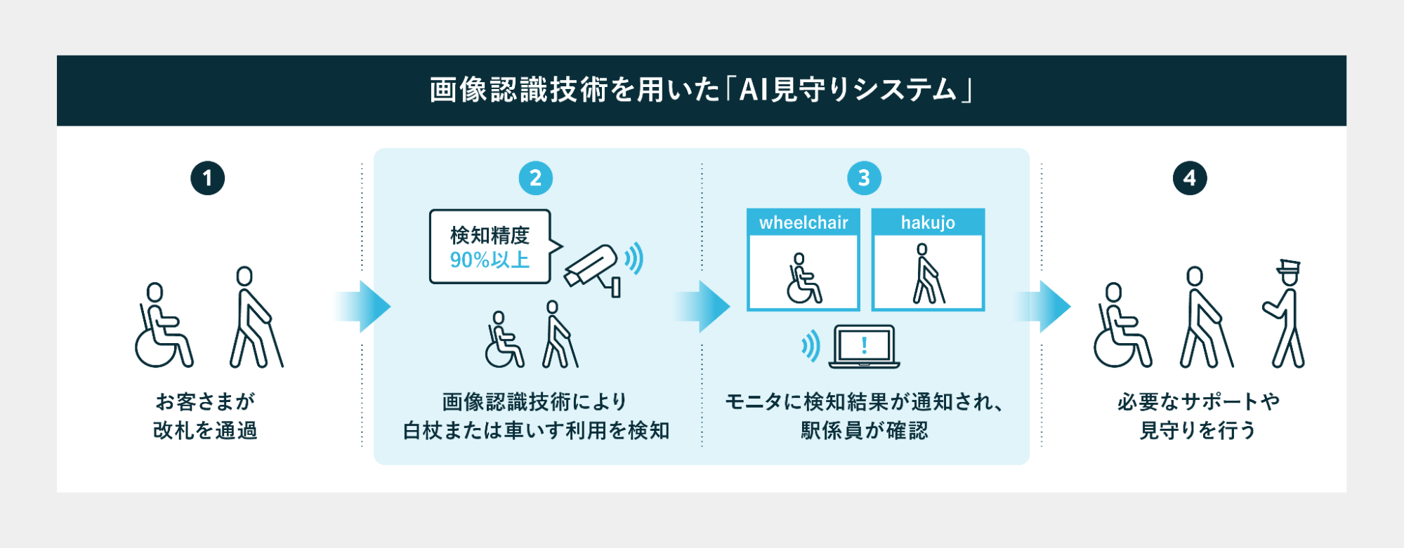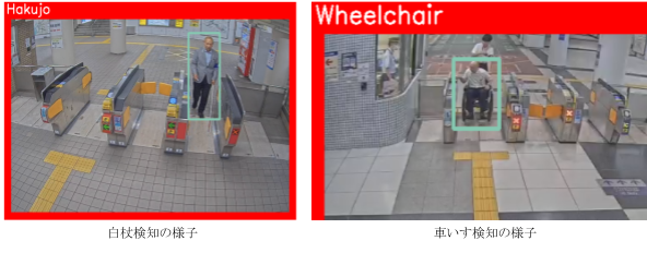 本システムは、既存の防犯カメラ映像から白杖または車いすをご利用のお客さまを検知して駅係員に通知するシステムです。2021年11月から実証実験を行いながら両社で共同開発を進め、検知率90%以上と高い検知精度が確認できたため本格導入に至りました。
