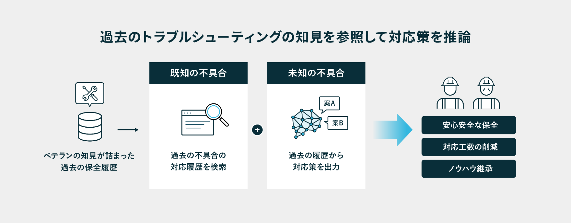 ベテラン技術者の退職に伴い、設備保全やトラブル対応における技術継承が課題に。実証実験を経て、過去の知見を活用した保全を実現