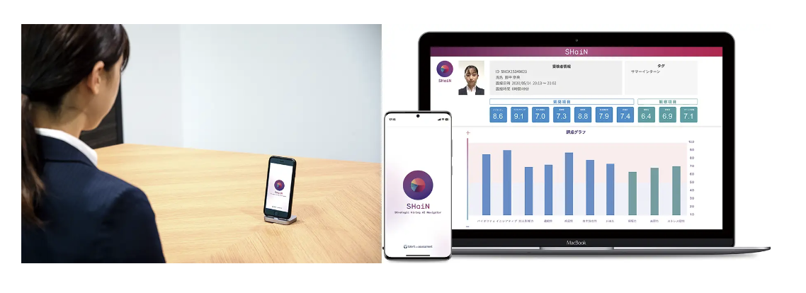 SHaiNでは、受検者はスマートフォンやタブレットを利用し、非対面・非接触で24時間365日、いつでもどの場所でもAIと対話しながら面接を行うことができ、日程による選考辞退などの機会損失を減らせるようになります。また企業側はAIによる面接評価レポートを参考に、採用可否だけでなく、対面の面接時には候補者ごとに適した質問の投げかけや、特徴に合わせた動機付けとして活用することができます。