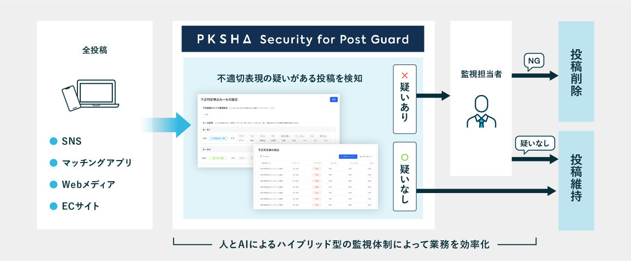 そこで、金融業界を中心にカード不正利用の検知システム等を提供してきた「PKSHA Secutity(※2)」の技術とノウハウ、並びに大手マッチングアプリ事業者や監視事業者などとの協業(※3)を通じて培った投稿監視業務におけるAIの社会実装実績を活かし、高精度な不正投稿検知を実施できるサービスとして「PKSHA Security for Post Guard」の提供を開始します。