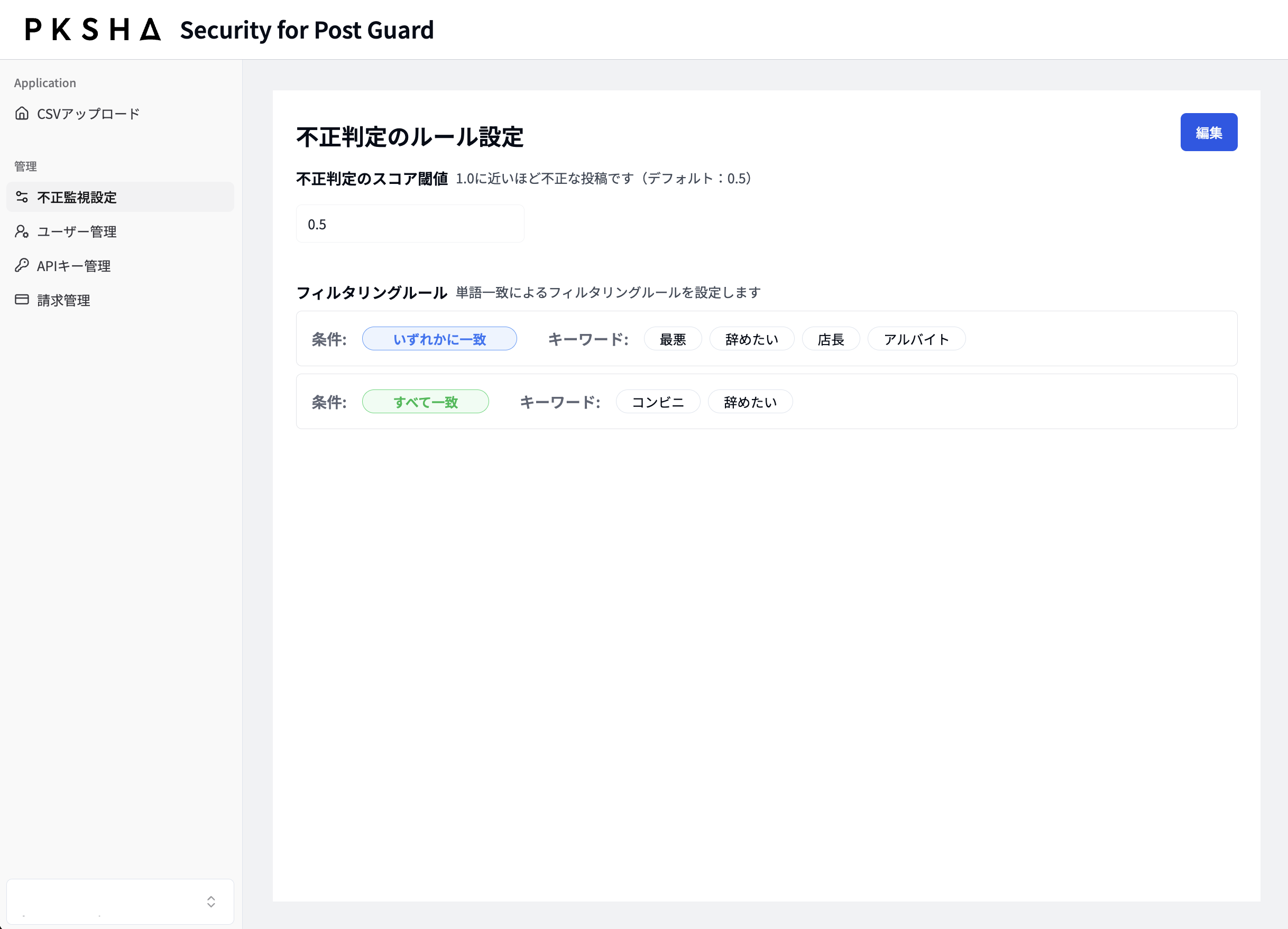なお、従来の不正投稿監視においては、主に人力のみで監視を行うサービスや、検知対象となるキーワードや画像を事前に設定の上で、関連する投稿を検知するサービス等にて対策を行ってきましたが、「PKSHA Security for Post Guard」では事前のキーワード設定に加えて、お客様自身が本サービスのUI を通じて、実際に遭遇した不正事例のデータを随時投入することで、そのサービス特有の不正パターンに特化した検知が可能となり、新たな不正トレンドにもAIが早期に追従することが可能となります。
